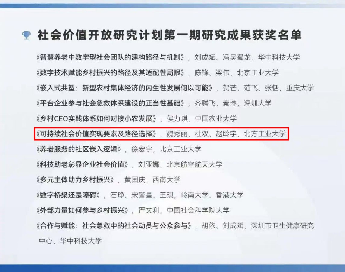 此次获奖不仅是对w66利来旗舰厅魏秀丽副教授团队研究成果的认可,也是对w66旗舰厅官网在社会责任和可持续发展研究领域实力的肯定,为推动企业可持续社会价值生态的构建贡献了北方工大的智慧和力量。