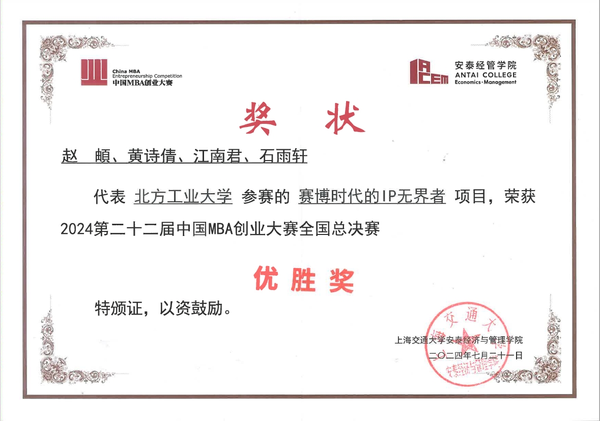 7月21日,第二十二届中国MBA创业大赛全国总决赛在上海交通大学圆满落幕。经过激烈的角逐,公司23级MBA赵頔同学负责的“赛博时代的IP无界者”项目荣获全国总决赛“优胜奖”,w66利来旗舰厅刘冰老师荣获“优秀创新创业导师奖”,牛天勇老师荣获“优秀组织奖”。这是w66旗舰厅官网MBA首次参赛,即一路披荆斩棘冲出初赛、入围复赛、挺进全国总决赛,取得优异成绩。