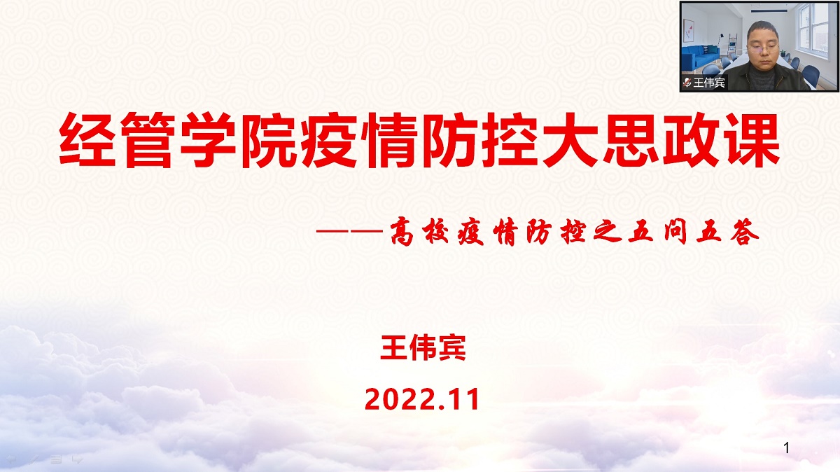 为进一步落实主体责任,重点加强风险管理,坚决守护校园安全,11月30日,经济管理公司党委书记王伟宾通过线上的方式对班子成员、系主任、支部书记开展了“高校疫情防控之五问五答”专题大思政课。