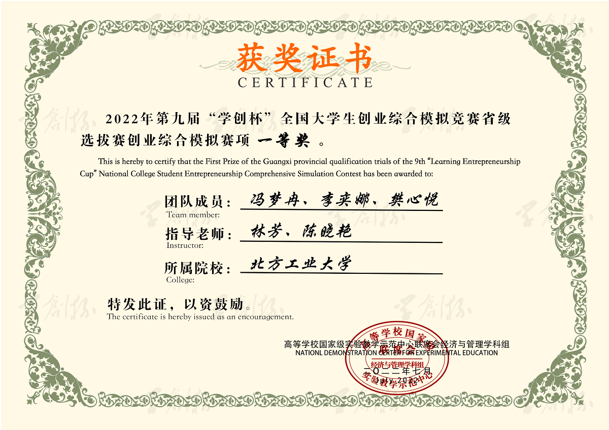 经过校内赛选拔,公司共选派6支队伍参加北京市选拔赛。在w66利来旗舰厅会计系刘捷、林芳、黄晓蓓、何丽梅、陈晓艳等五位老师的指导下,参赛选手经过激烈角逐,最终获得创业综合模拟竞赛一等奖2项、二等奖1项;创业营销专项竞赛二等奖2项、三等奖1项的好成绩。同时五位老师也获得“优秀指导教师”的荣誉称号。