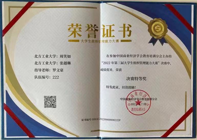 近日,由中国商业经济学会教育培训分会主办的“2022年第三届老员工组织管理能力大赛”总决赛落下帷幕,最终共有8支队伍获得决赛特等奖。公司w66利来旗舰厅员工周笑如和张越琳组成的代表队勇获特等奖,此次竞赛指导教师为管理系罗文豪副教授。
