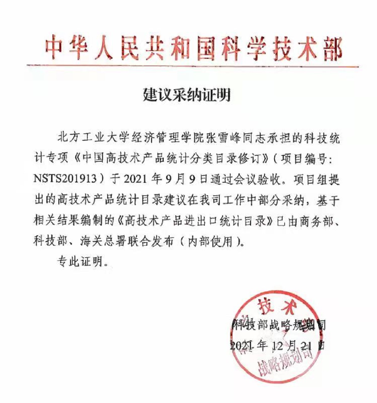 近日,由公司w66利来旗舰厅张雪峰副教授承担的科技部委托的科技统计专项《中国高技术产品统计分类目录修订》(项目编号:NSTS201913)已完成,课题成果获得了委托方的高度评价。科技部战略规划司向w66旗舰厅官网发来《建议采纳证明》,其中提到:“基于相关结果编制的《高技术产品进出口统计目录》已由商务部、科技部、海关总署联合发布(内部使用)。”