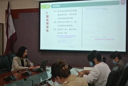 会议开始,陈旭霞老师统一讲解了毕业去向的流程,就业推荐表和三方协议填写说明,报到证相关概念,以及公司就业网上填写要求。陈旭霞老师提醒毕业生一定要牢记时间截止日期,及时汇报就业情况。随后,赵洁书记分析了当前就业的严峻形势以及可能所面临的问题,提醒毕业生同学面对就业时不要犹豫也不要擅自主张,积极和公司及老师沟通,按要求落实好就业工作。