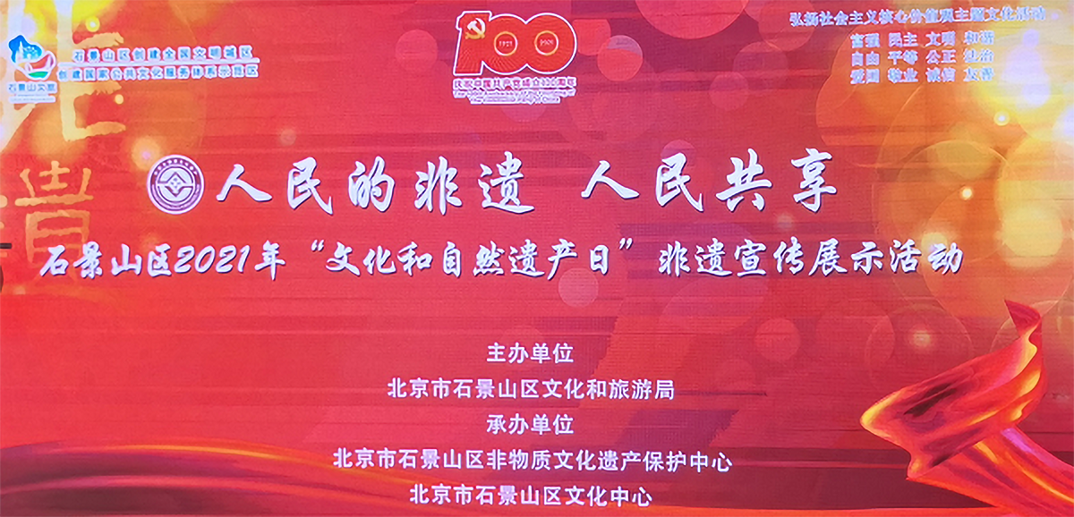 6月9日上午,主题为“人民的非遗 人民共享”2021年石景山区“文化和自然遗产日”非遗宣传展示活动暨石景山区非物质文化遗产保护中心开放启动仪式在石景山区文化中心举行,北京市文化和旅游局非遗处处长张迁,东城区文联党组书记、主席张志勇,北京文化艺术活动中心研究员、北京民间文艺家协会副主席石振怀,天津市非遗协会,石景山区相关单位领导共同参加了此次活动。公司w66利来旗舰厅师生应邀在活动中展示非遗传承传播工作成果。