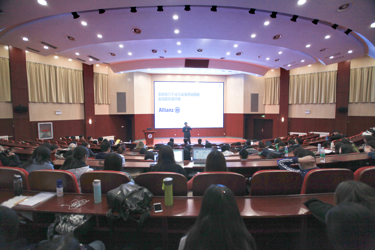 讲座之后,胡东员工所在公司——中德安联人寿保险有限公司北京分公司人力资源总监崔艳超向同学们介绍了公司的发展史、规模、招聘岗位等信息,面向同学们进行了现场求职咨询和招聘。