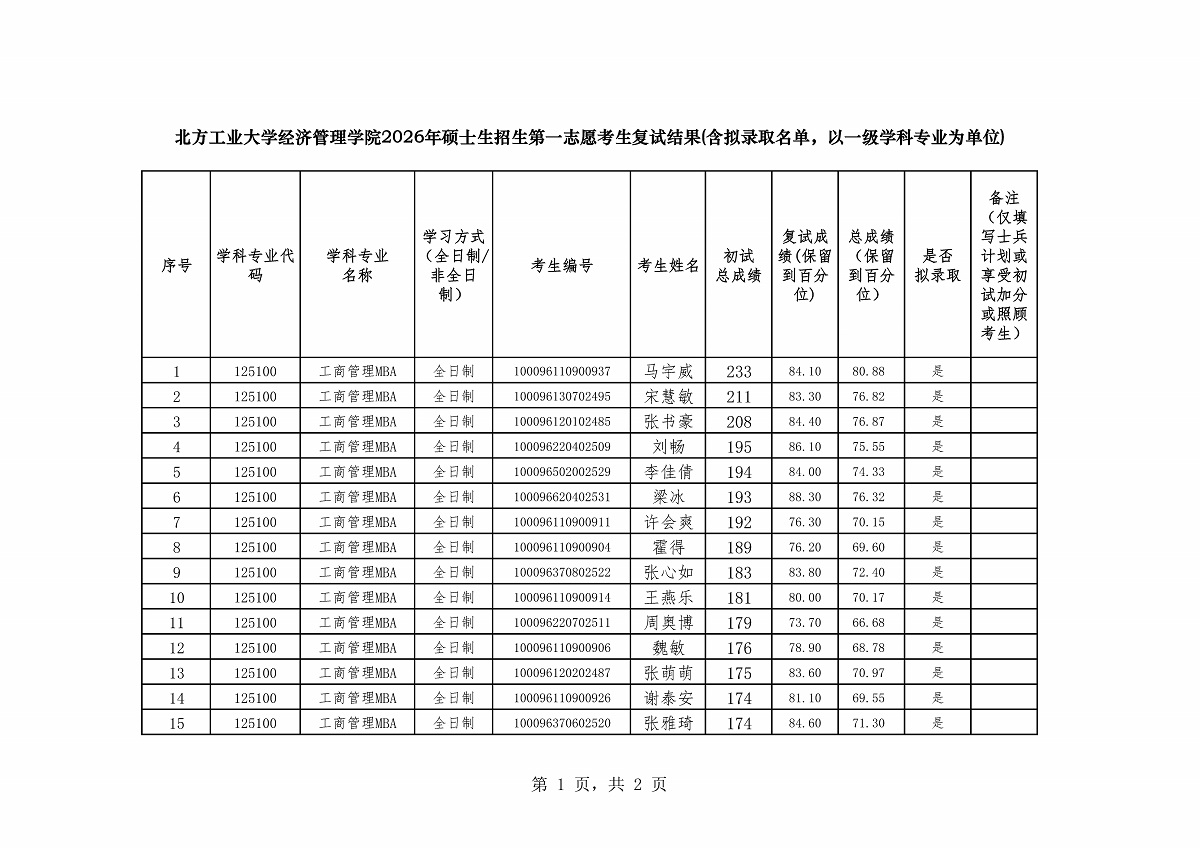 w66利来旗舰厅2026年硕士生招生第一志愿考生复试结果——工商管理MBA(全日制)