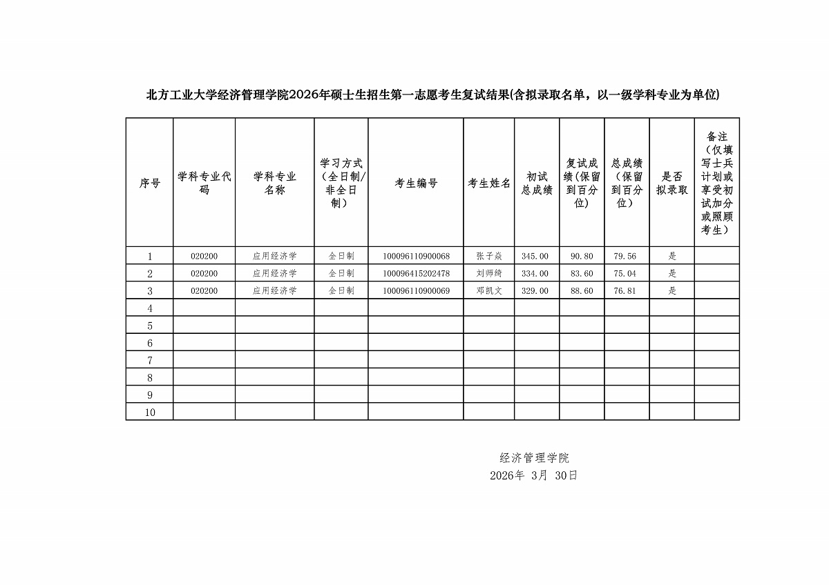 w66利来旗舰厅2026年硕士生招生第一志愿考生复试结果——应用经济学
