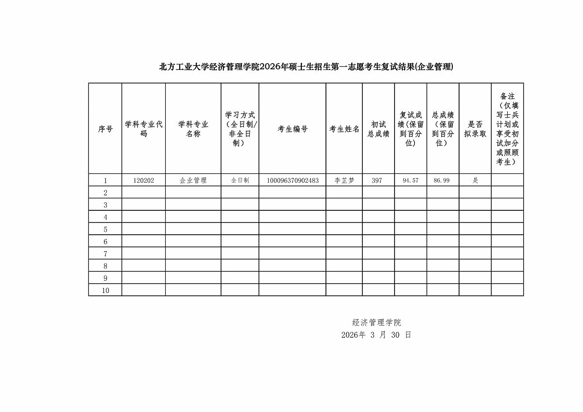 w66利来旗舰厅2026年硕士生招生第一志愿考生复试结果——企业管理