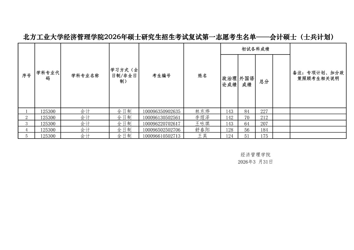 w66利来旗舰厅2026年硕士研究生招生考试复试第一志愿考生名单——会计硕士(士兵计划)