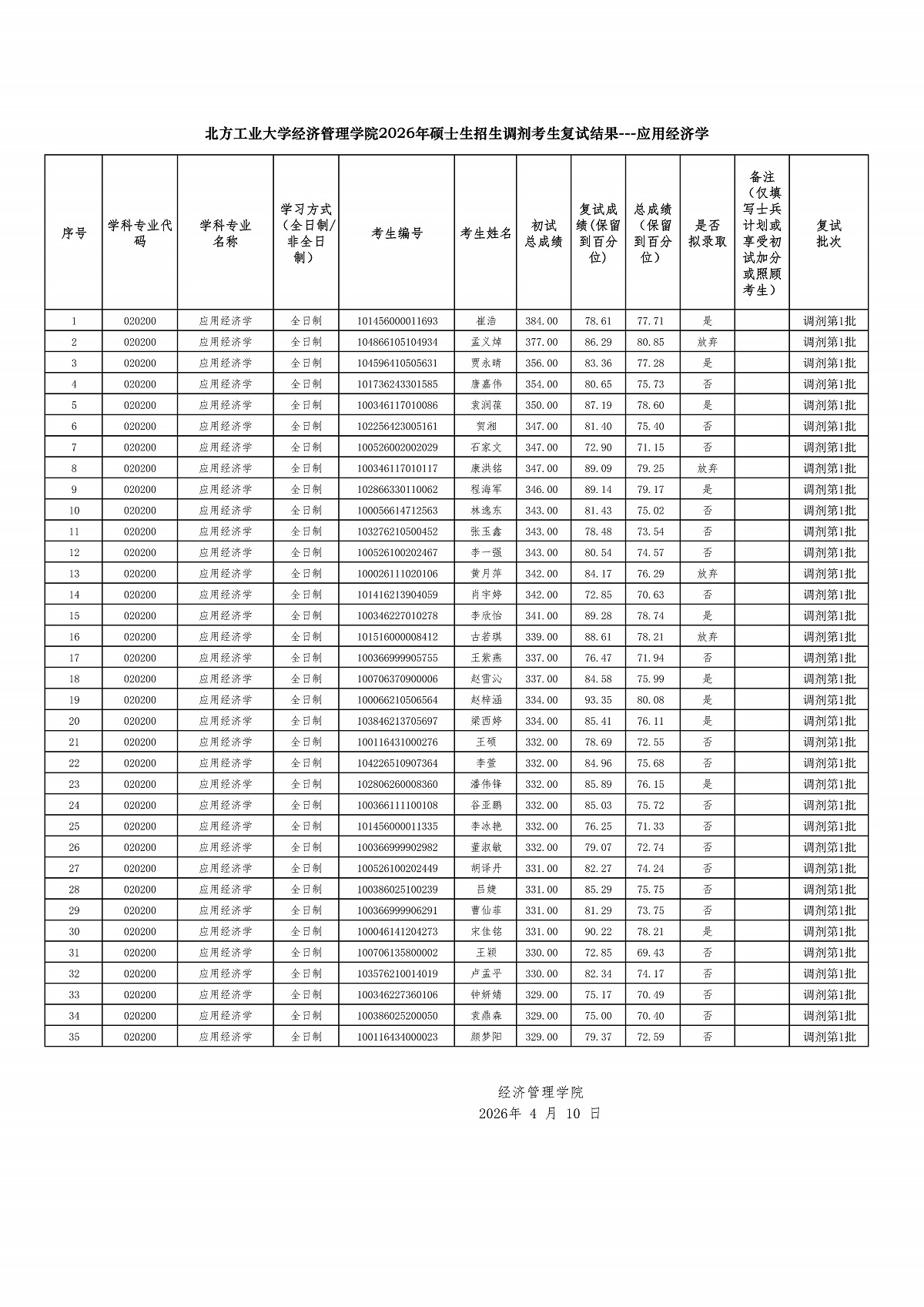 w66利来旗舰厅2026年硕士生招生调剂考生复试结果---应用经济学