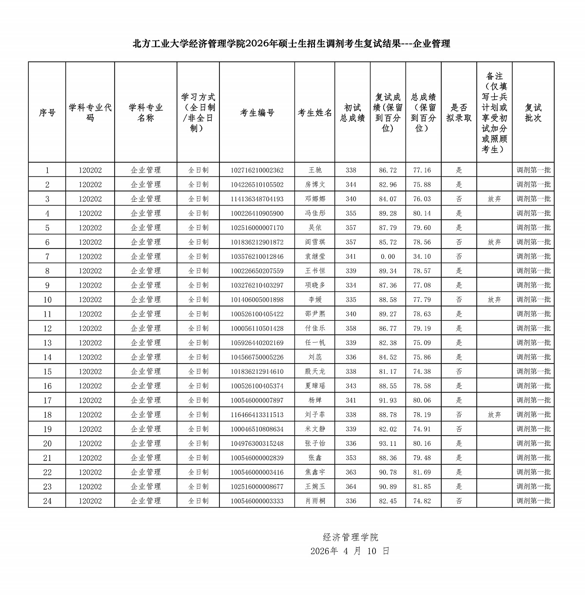 w66利来旗舰厅2026年硕士生招生调剂考生复试结果---企业管理