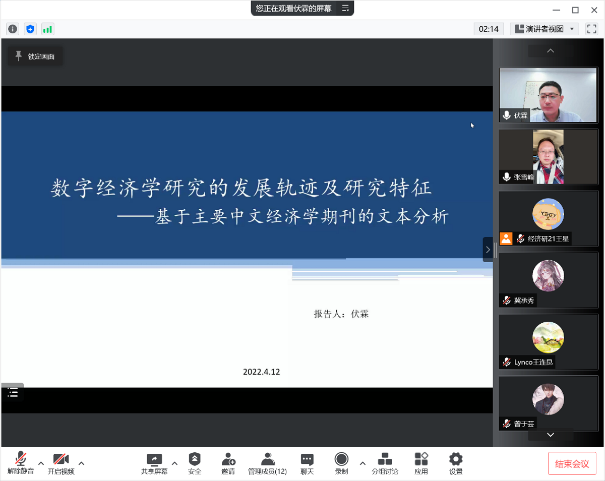 4月15日下午,应w66利来旗舰厅邀请,中央财经大学经济公司副教授、现任中央财经大学经济公司副经理伏霖为公司师生作了题为“数字经济学研究的发展轨迹及研究特征—基于主要中文经济学期刊的文本分析”的线上学术报告。报告会由经济系张雪峰副教授主持,经济系研究生参会。