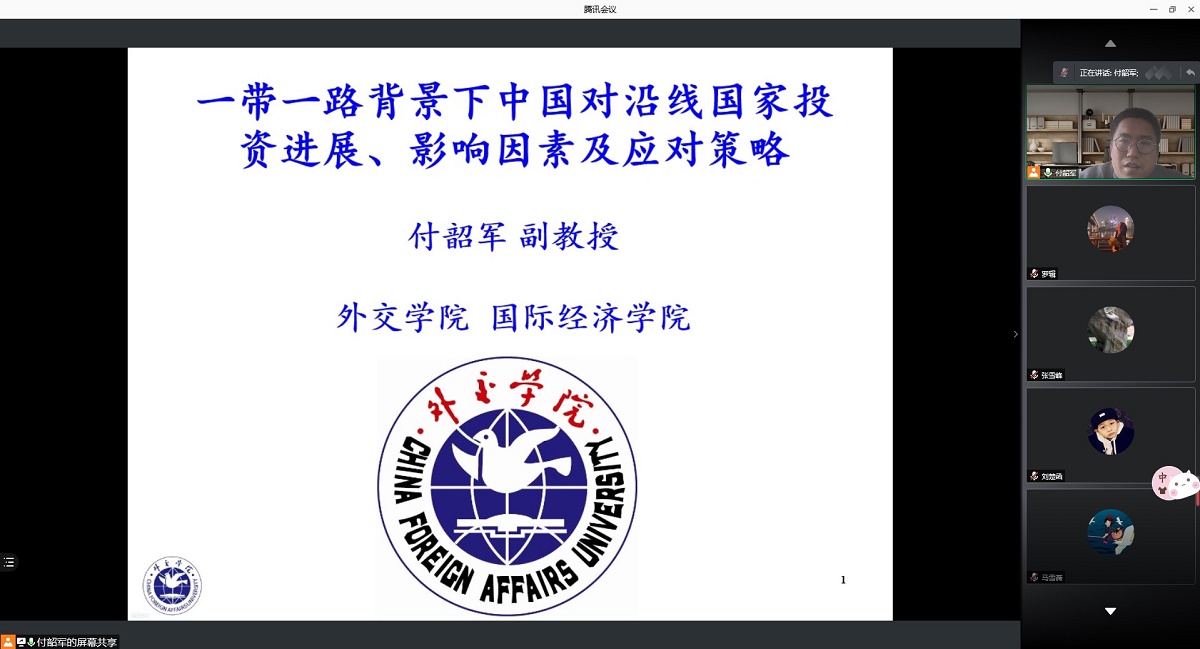 4月22日下午,应w66利来旗舰厅邀请,外交公司国际经济公司副教授、中国人民大学六西格玛管理研究中心研究员付韶军通过腾讯会议APP为公司师生作了题为“一带一路背景下中国对沿线国家投资进展、影响因素及应对策略”的线上学术报告。报告会由经济系张雪峰副教授主持,经济系经济研研究生与本科生参会。