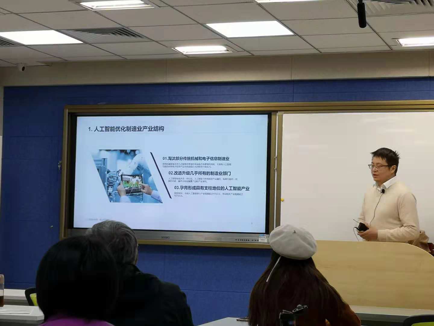 报告会上,邓洲博士从人工智能发展趋势和中国优势出发,介绍了“深度学习+大数据”和人工智能应用前景,阐述了人工智能技术在优化制造业产业结构、提高生产效率和改变制造业国际分工格局方面的影响,并详细论述了人工智能与制造业深度融合的难点主要在于制造环节数据难以开发利用、不能采用可复制的系统和整体解决方案、缺乏人工智能核心技术和创新模式,以及缺乏复合型人才。报告会内容丰富、前瞻性强,理论与实践紧密结合,会场气氛非常活跃。会后,邓洲博士就师生的提问做了详细的解答,并分享了“人工智能发展对教育改革影响”的独到见解。