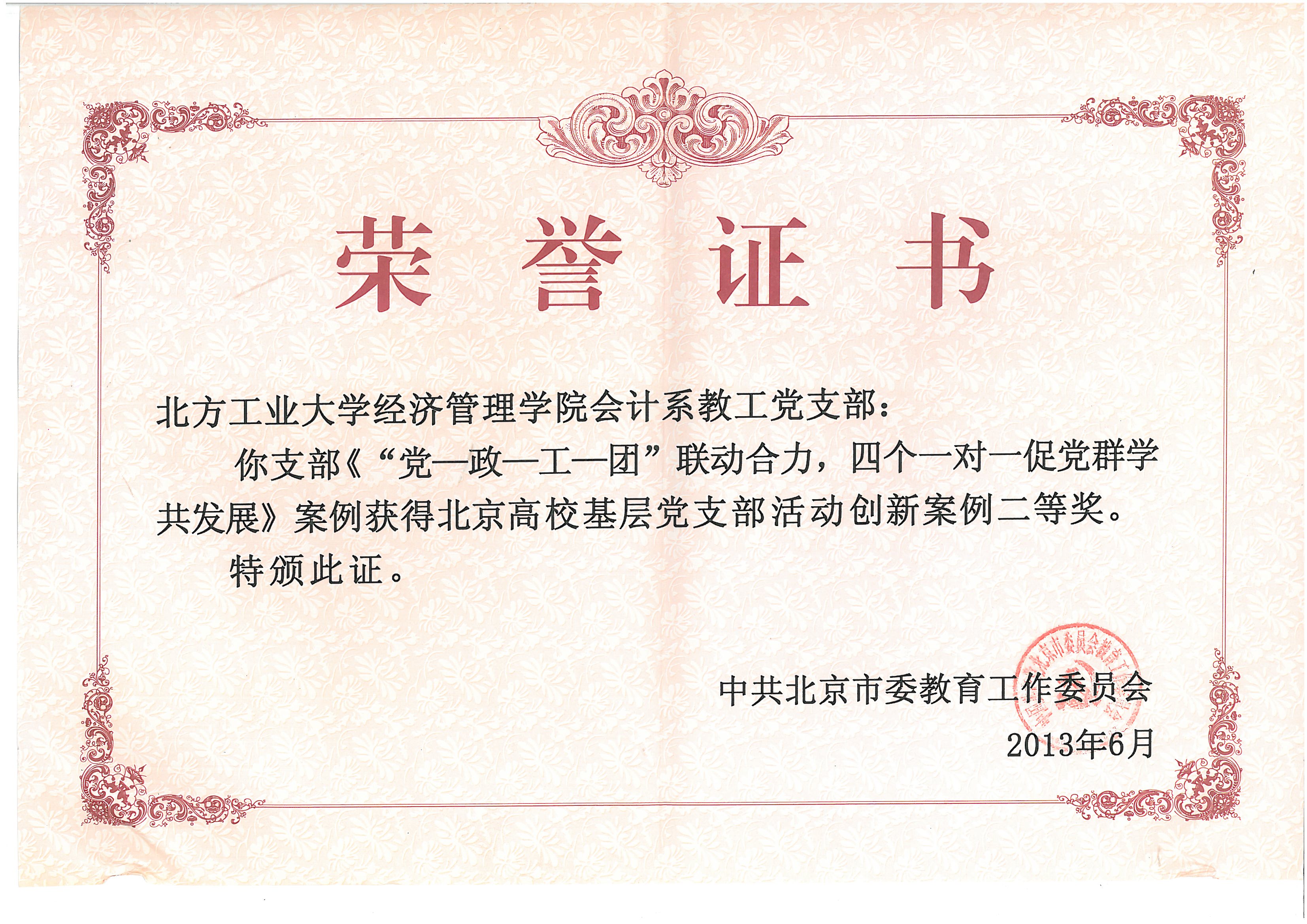 2011年,会计系被北京市教育工委评为“教育先锋号”先进集体。