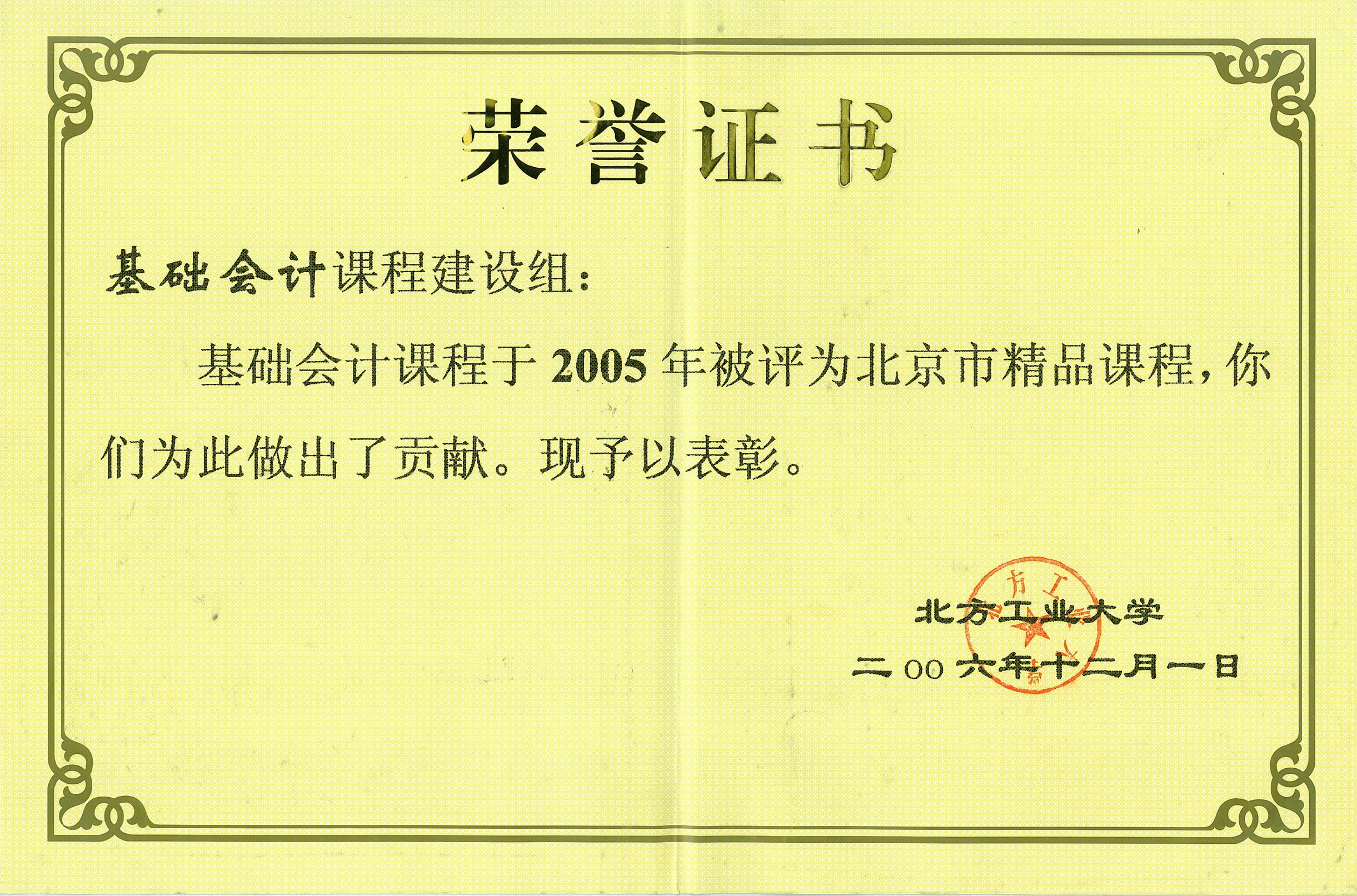 2005年,《基础会计》课程被评为北京地区高等公司市级精品课程。