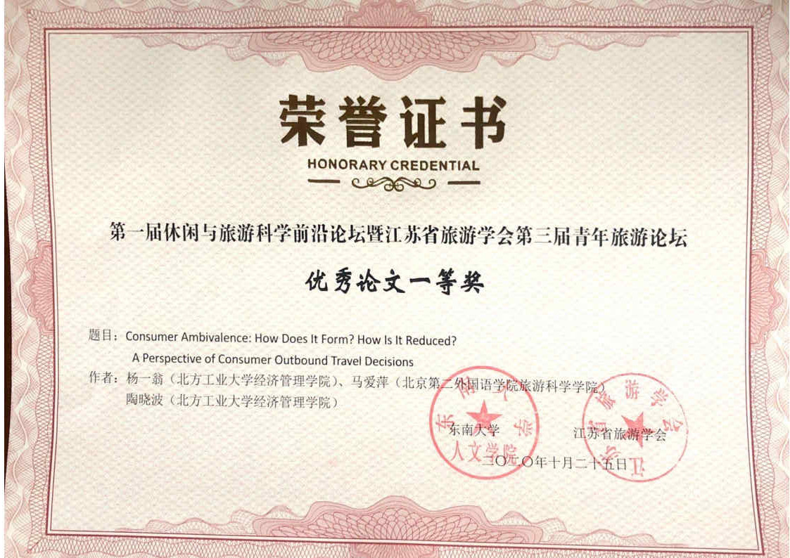 杨一翁、陶晓波等老师荣获第一届休闲与旅游科学前沿论坛暨江苏省旅游学会第三届青年旅游论坛优秀论文一等奖 |