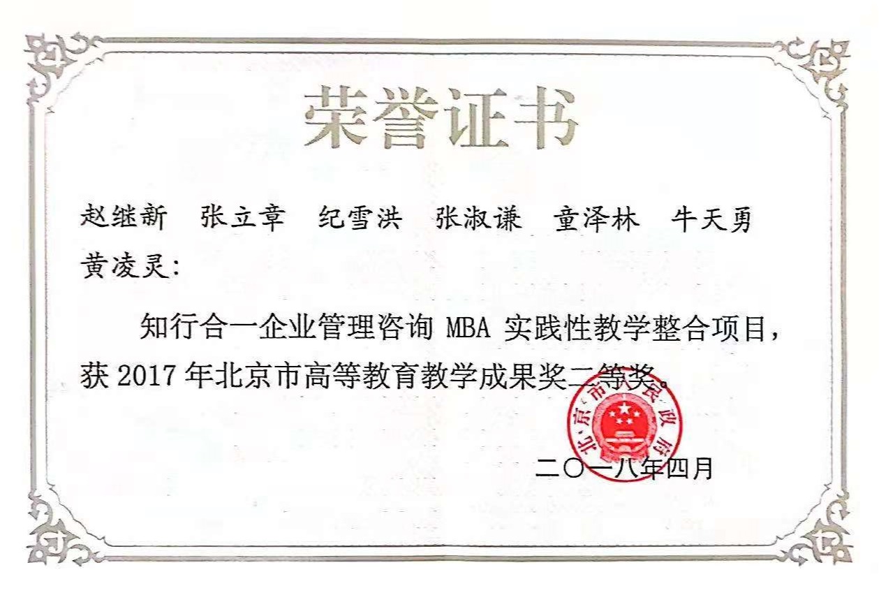 专业教师注重教学研究,2019年成功申报教育部工商管理教育指导委员会公司产品改革课题2项;近年获北京市教学成果二等奖2项;专业骨干课程《市场营销管理》为北京市级高等公司精品课程、北京市课程思政示范课程,《市场营销管理》教材被评为北京高等教育精品教材;《管理学》、《人力资源管理》为北京市优质本科课程;《管理学》被教育部工商管理教育指导委员会评为国家级“金课”。“组织与人力资源管理本科育人团队”获评北京高校优秀本科育人团队。