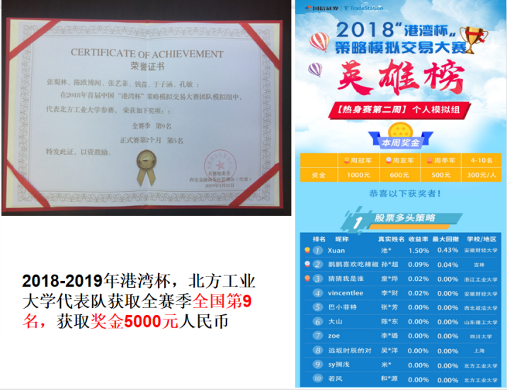 自2016年招生以来,“教-习-赛-研”一体化应用型人才培养模式不断实践并获得社会的认可。2022年软科中国大学专业排名全国第七,评为A类。员工应用能力突出,2021年共青团中央举办的全国第七届“东方财富杯”金融大赛中,本专业员工包揽国赛阶段北京地区高校前5名。2018年首届全国“银科控股杯”智能交易大赛中,本专业团队仅次于当年的冠军队南京大学,获全国亚军,并获取奖金5万元人民币及20%的实盘收益(实盘本金50万人民币)。