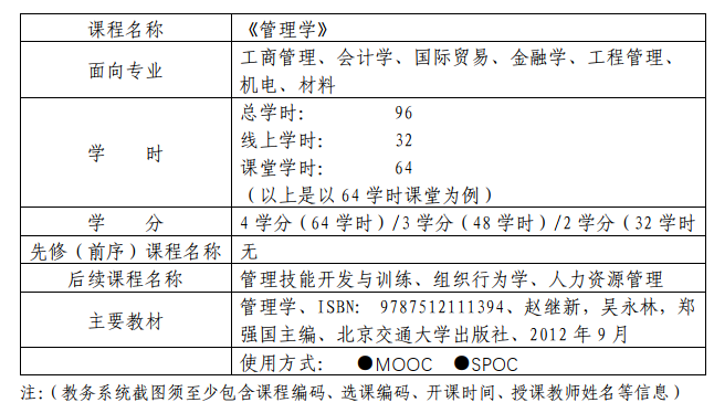本课程是经济管理学公司的院级平台课,公司和公司两级一直持续对本课程进行建设,发展历程分为三个阶段:(1)平台课建设。这一时期的建设主要以完善线下的管理学的教学内容和教学方式、考评方式为主。(2)利用公司的多模式教学网和蓝墨云班课进行线上和线下教学的初步尝试。(3)开发了管理学MOOC。管理学的在线课程于2019年9月上线中国大学慕课网,同时开始了线上和线下混合式教学的真正实践。