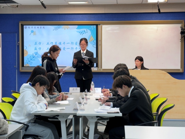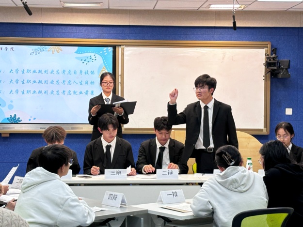 活动共12支队伍参赛,6支队伍晋级复赛。各队伍围绕辩题展开了激烈的探讨。赛场上,同学们据理力争、妙语连珠,展现了敏捷的思辩能力和优秀的表达能力。最后,3支队伍成功晋级决赛,围绕“老员工职业规划更应注重自身技能/个人目标/就业前景”展开了激烈讨论。三方各执不同观点,从不同方向、不同切入点进行论辩。