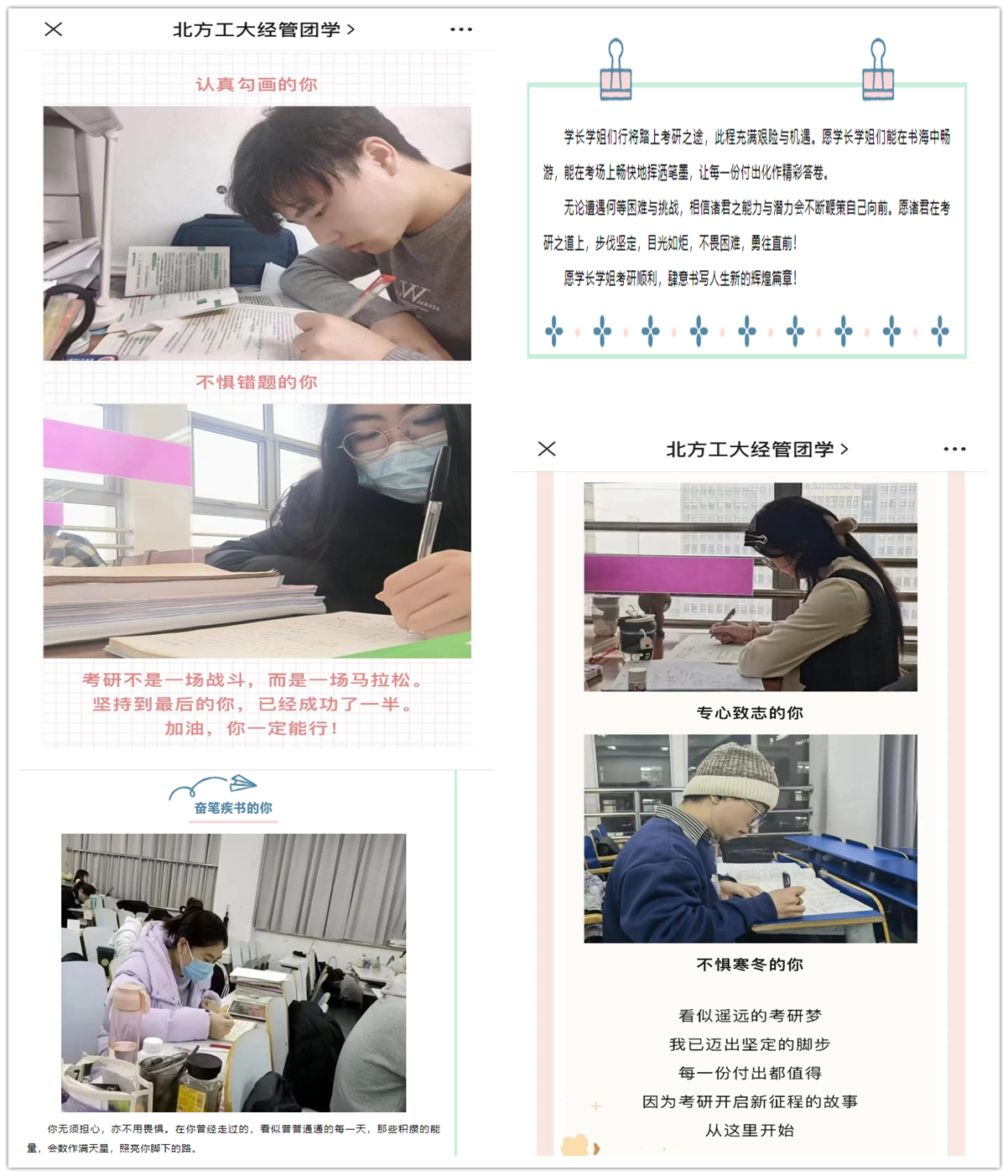 同时,公司团学公众号在考研倒计时最后10天,每天连续推送学长学姐们努力奋斗的模样和学弟学妹们的祝福,并在推送中针对近期考生可能出现的心态调整问题给出了温馨提示,鼓励他们在最后冲刺阶段保持良好心态,全力以赴迎接考试,并预祝全体考生取得优异成绩。