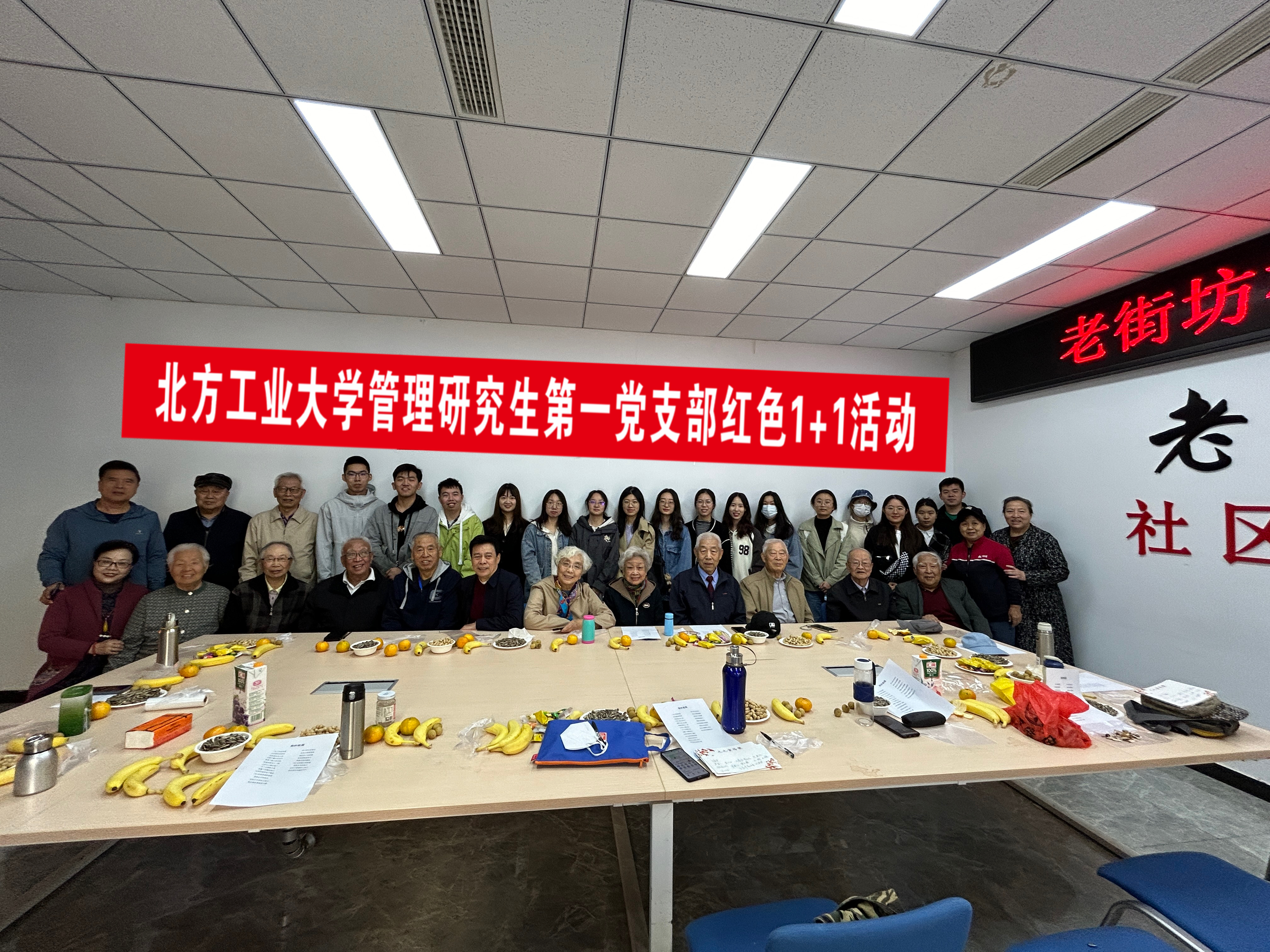 为深入学习贯彻习近平新时代中国特色社会主义思想,赓续红色血脉,弘扬爱老敬老精神,深化红色1+1合作共建,在重阳节即将到来之际,10月22日上午,w66利来旗舰厅管理研究生第一党支部联合苹果园二区第六党支部共同举办“传承红色基因 增添幸福底色”红色1+1主题活动。支部党员、积极分子代表20余人参加活动。
