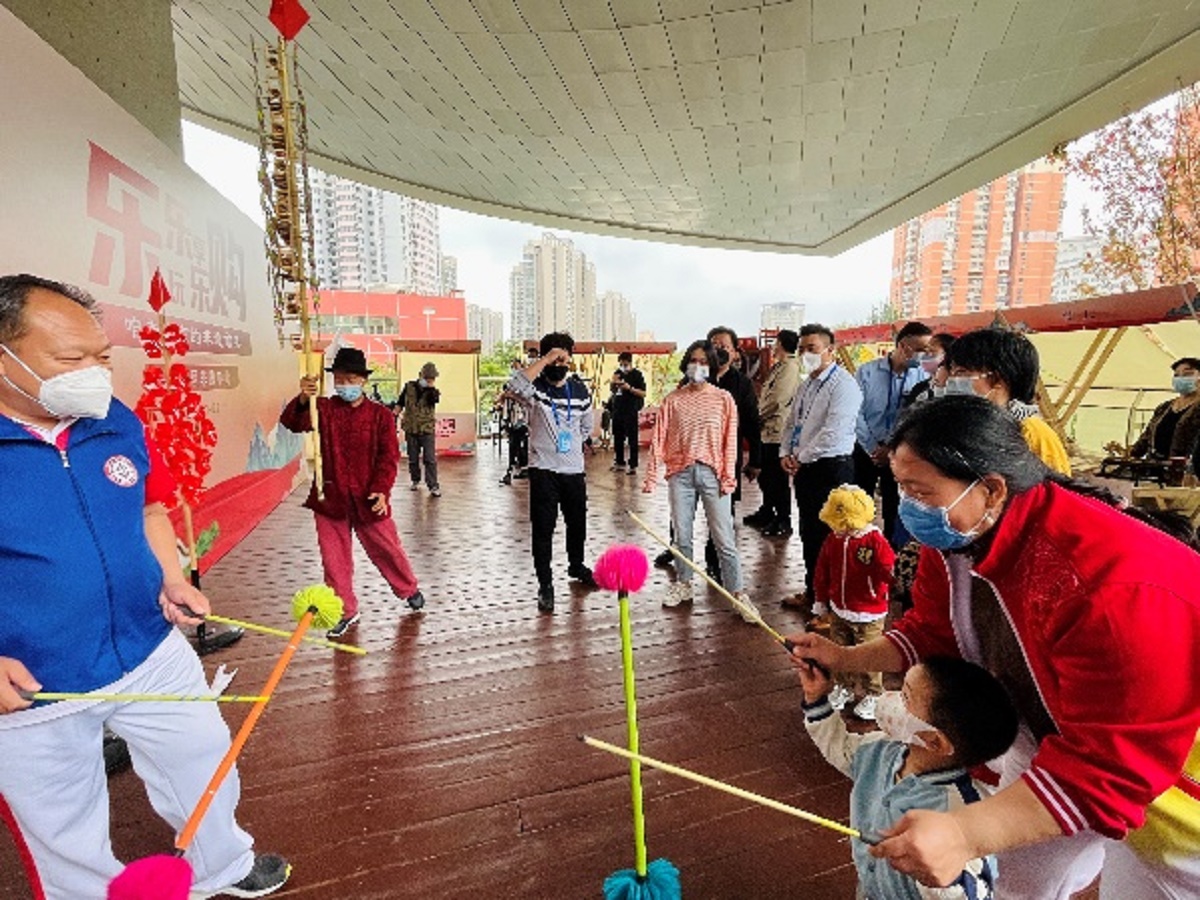 在现场,市集观众不仅可看、可听,还可以在支部志愿者的示范与指导下进行抖空竹和打花棍的互动体验。市集观众的学习热情十分高涨,场面一度热闹非凡。志愿者在维护秩序的同时也与传承人进行了太平鼓和打花棍的交流学习,进一步了解传统体育技艺,加深对非遗的记忆,更好的传播非遗文化,为进一步的共建活动作好铺垫。