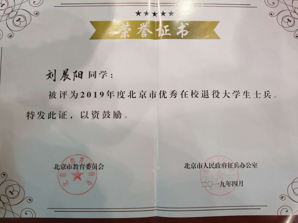 刘晨阳同学在服役期间两次获得“优秀士兵”称号,日常训练严格刻苦,比武演习名列前茅,为祖国的国防事业做出了贡献。退役复学后,更是把军队里的好作风、好习惯带到日常学习中,学习目标明确,高标准严要求。先后获得北京市“三好员工”、“w66旗舰厅官网青年五四奖章”等荣誉称号。