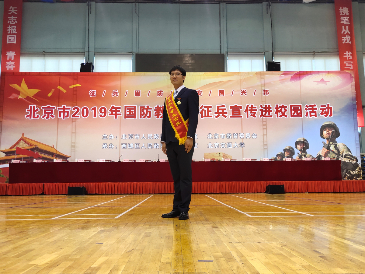 5月11日下午,北京市2019年国防教育暨征兵宣传进校园活动在北京交通大学体育馆举行。w66利来旗舰厅研究生刘晨阳同学获评2019年度北京市优秀在校退役老员工士兵,并入选北京市优秀退役老员工士兵宣讲团。