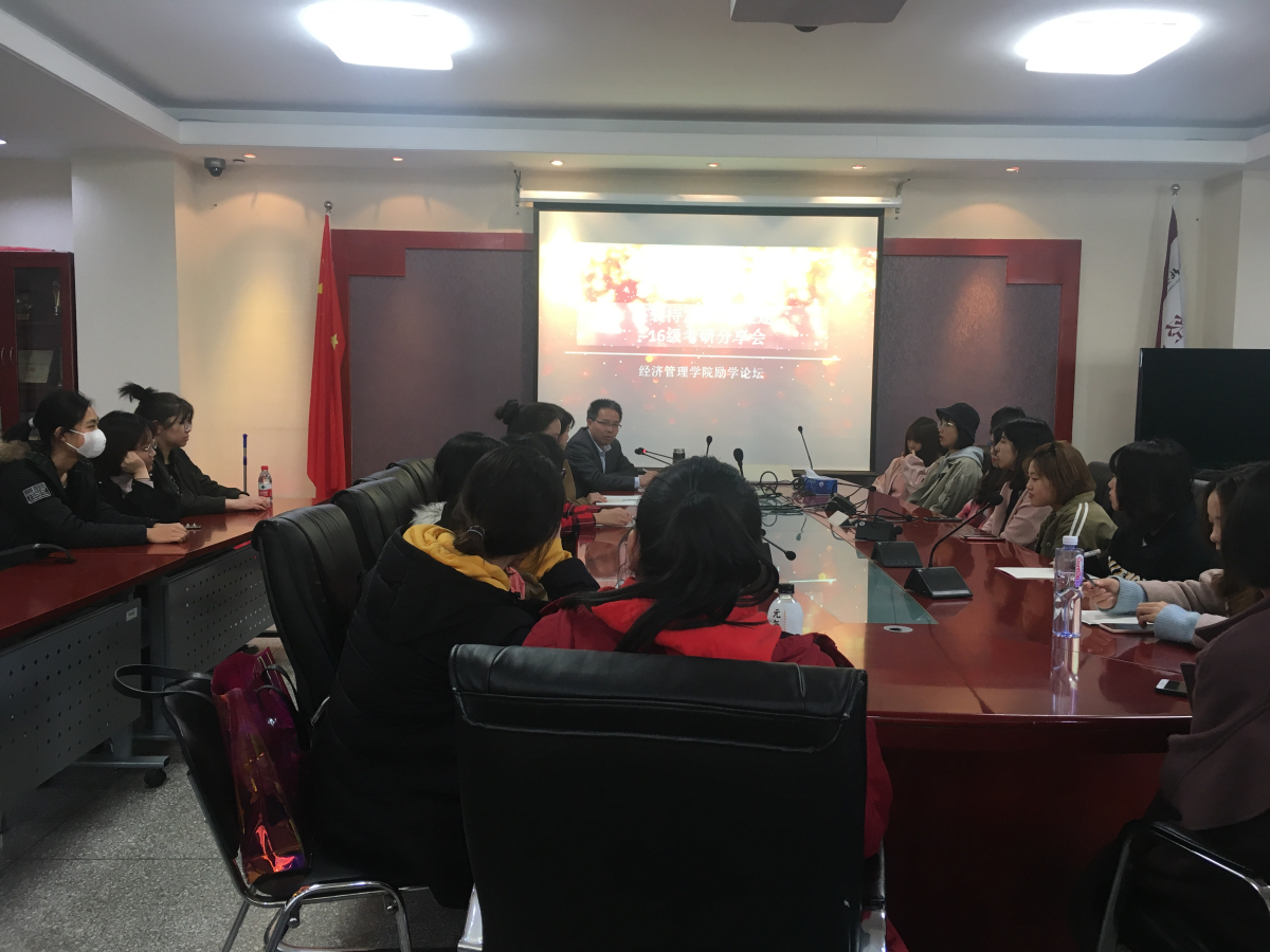 4月10日下午,w66利来旗舰厅在励学201举行16级国贸金融专业考研分享会。本次论坛邀请到了经济系教工党支部书记王书平老师,16级辅导员吴芳及20余名大三员工参加了此次论坛。