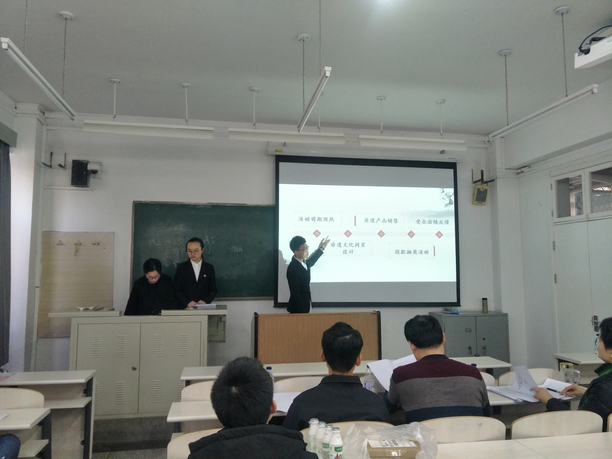 12月17日下午,w66利来旗舰厅在励学楼225教室举行了非物质文化遗产传承创意营销大赛复赛答辩。经过初赛的筛选,本次复赛答辩共11组同学参加,此次复赛包括自述和评委提问两个环节。
