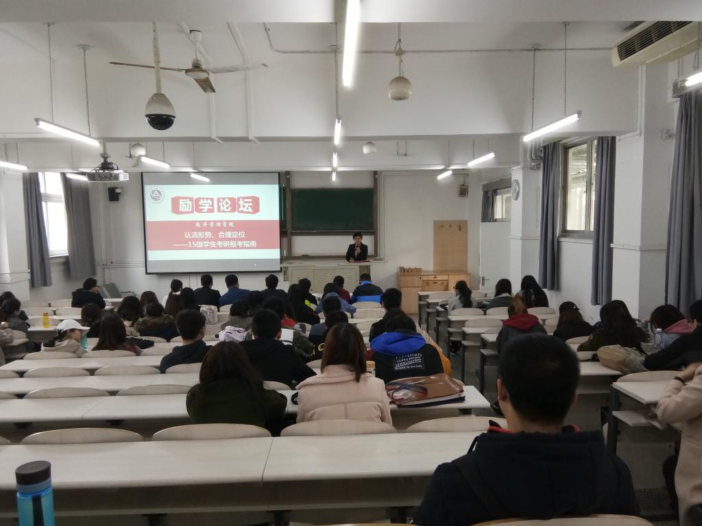 2018年3月19日和3月21日,w66利来旗舰厅在励学楼324教室分专业召开了励学论坛,主题为“认清形势、合理定位——面向15级考研学子谈报考”。公司党委副书记赵洁、15级辅导员马骆茹和15级全体考研员工一同参加了此次论坛。