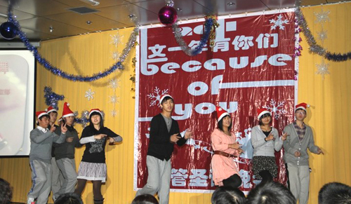创意十足的开场视频和激情四射的圣诞舞蹈拉开了晚会的序幕。公司党总支副书记张加强老师代表公司向全体同学送去了祝福,肯定了一年来大家在各方面取得的成绩,希望大家继续发扬优良的作风,争取更大的进步。同学们通过《少年梁祝》、《人类感情恋爱发展史》、《老员工活》、《东厢记》等节目生动幽默地表达了对于老员工活的理解。自编自演的舞蹈《Christmas Bar》和歌曲《圣诞串串烧》表达了同学们的美好祝愿,赵灯兵老师的歌曲《等待》将晚会气氛推向高潮。晚会过程中,大家还通过祝福便利贴的形式,表达了新年美好的愿望。整个晚会,掌声、欢笑声此起彼伏,气氛热烈。
