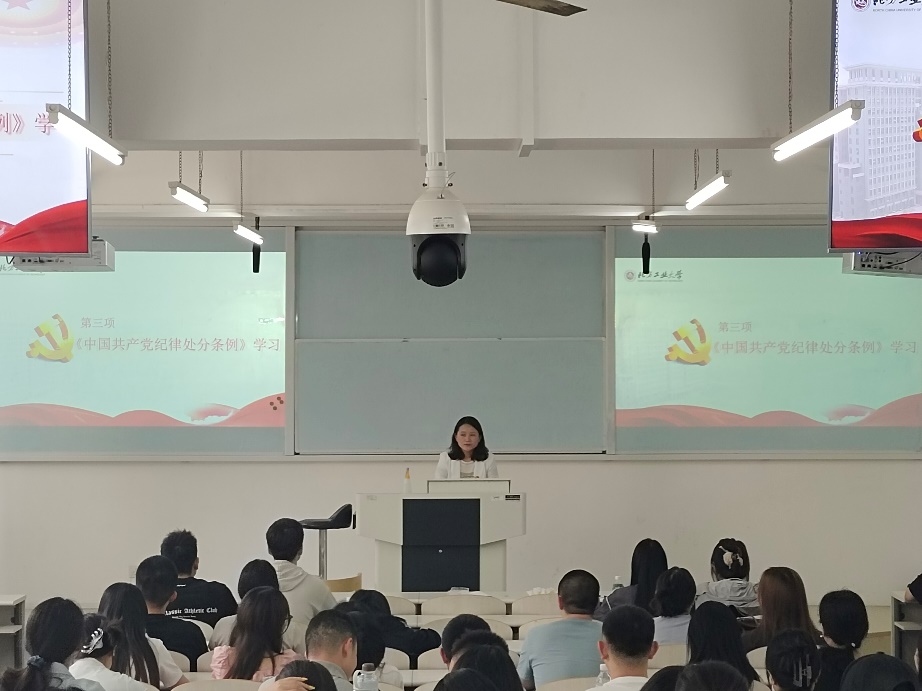 王帏副书记向全体毕业生党员讲解了《中国共产党纪律处分条例》的主要内容,并结合实际警示教育案例让同学们深入领会了“六大纪律”的具体内涵。王老师呼吁各位毕业生党员珍视自己的政治身份,做好模范带头作用,要坚定信仰,铭记自己的党员身份,不忘初心,牢记使命,树立正确就业观念,要求毕业生党员做到心中有党、心中有戒,在未来的工作中砥砺前行,开启人生新篇章。