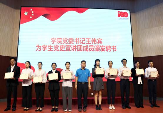 之后,王伟宾书记为员工党史宣讲团成员颁发聘书,并结合习近平总书记在庆祝中国共产党成立100周年“七一勋章”颁授仪式上的重要讲话,为新发展党员做了培训。他强调,站在“两个一百年”奋斗目标的历史交汇点上,同时面对当今世界百年未有之大变局,党史学习教育意义重大,建党百年,是我们学习的新起点,我们要继续不断学习实践中国共产党人坚定信念、践行宗旨、拼搏奉献、廉洁奉公的高尚品质和崇高精神,武装自己,在实践中更好的发挥党员的先进性。新入党的同学要认真学习党史、新中国发展史、改革开放史和社会主义发展史,继续深入了解我们党领导人民进行艰苦卓绝的奋斗历程,从灵魂深处涵养爱党爱国的深厚情怀,真正做到立得住信念、守得住初心使命、经得住风浪考验。