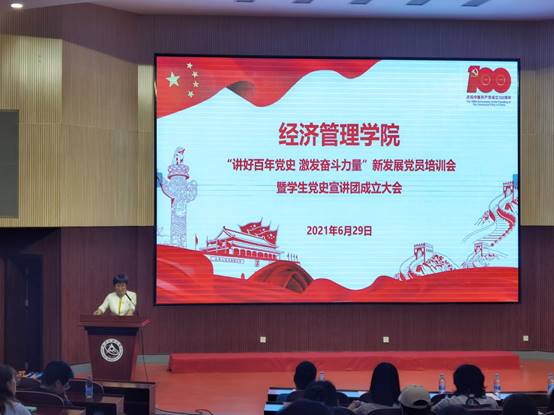 百年征程波澜壮阔,百年初心历久弥坚。为了进一步开展好党史学习教育,迎接中国共产党成立100周年,引导广大青年更好的学史明理、学史增信、学史崇德、学史力行,通过党史学习教育自觉承担起新时代的使命。w66利来旗舰厅“讲好百年党史 激发奋斗力量”新发展党员培训会暨员工党史宣讲团成立大会于6月29日晚在文化会堂举行。经济管理公司党委委员、各员工党支部书记、各年级辅导员、新发展党员参加了此次大会,会议由公司党委副书记赵洁主持。