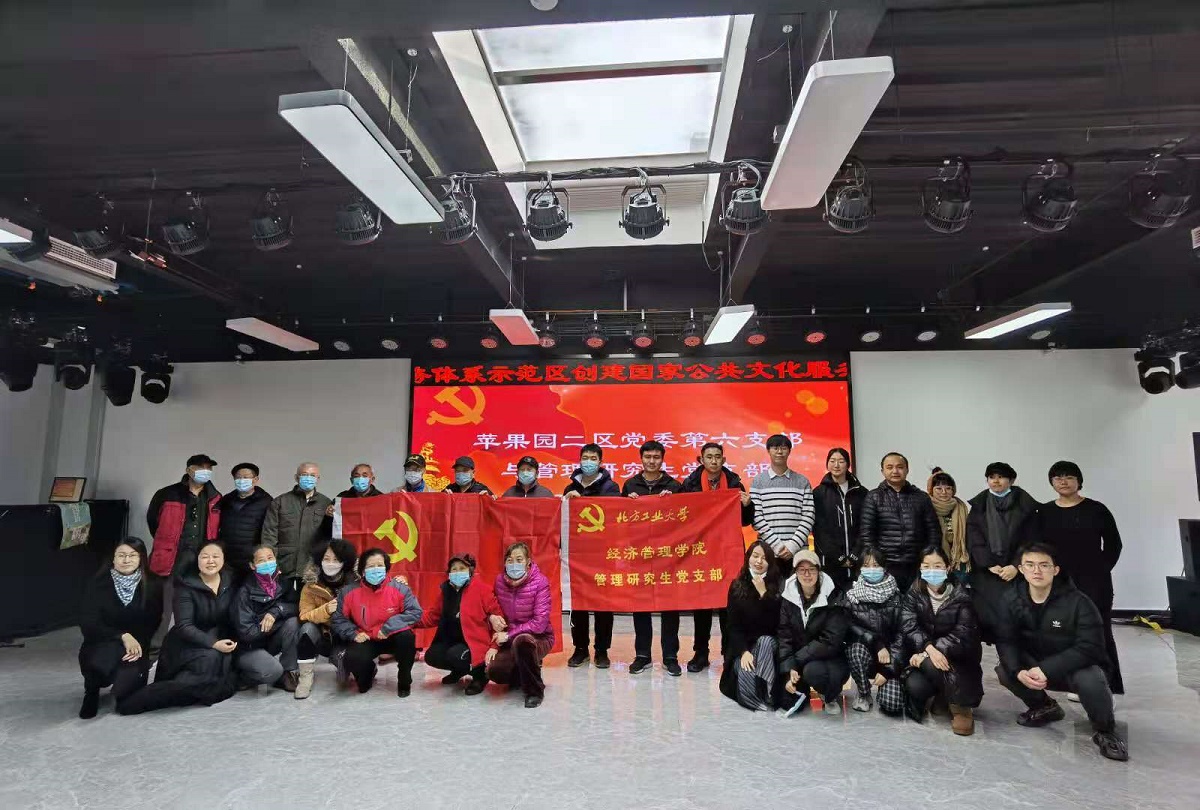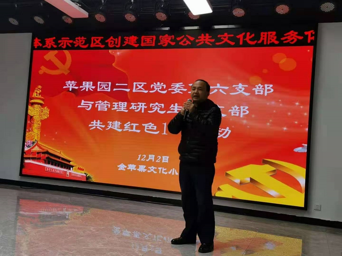 为深入学习贯彻习近平新时代中国特色社会主义思想,继续扎实推进“不忘初心、牢记使命”主题教育及公司基层党建工作,进一步加强员工党员、预备党员、积极分子的党性教育,增强党员的服务意识和责任意识。2020年12月2日,管理研究生党支部的党员和积极分子,在支部书记涂剑波老师的带领下走进苹果园社区,同苹果园二区党委第六支部的老党员们开展了“共建红色1+1”活动。