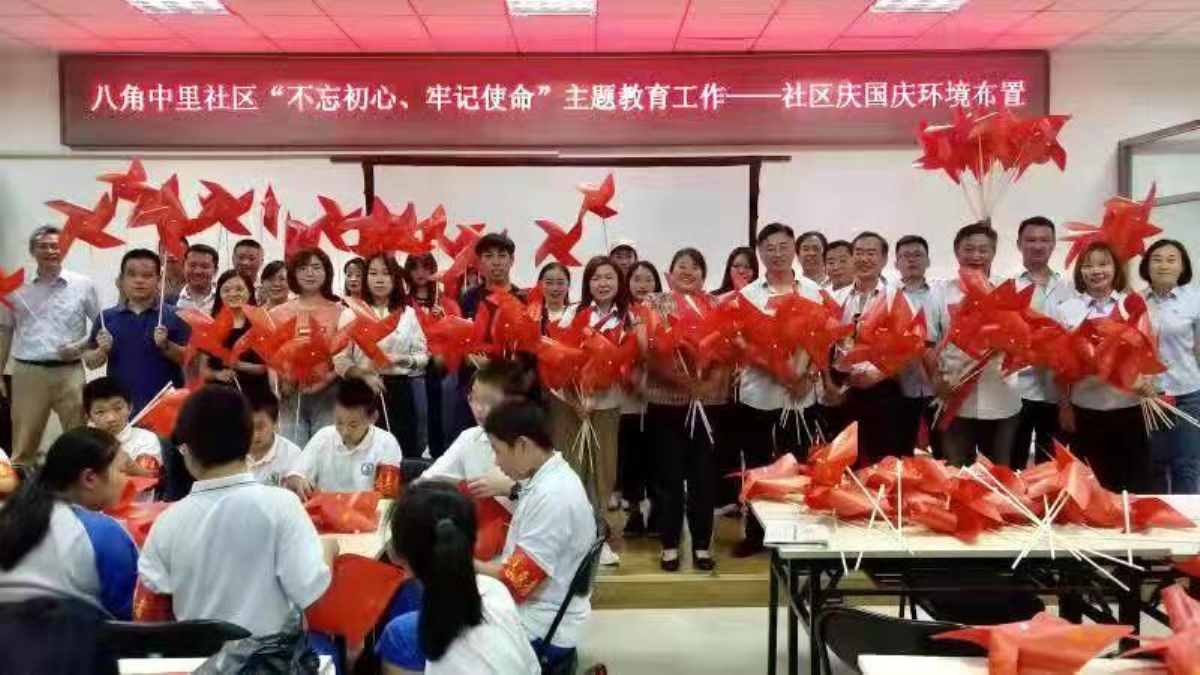 座谈会后,员工党员与社区党员、中小员工和一起动手为社区进行迎国庆环境布置。大家制作了带有国旗图案的风车,并前往社区空地,将风车摆放成“庆70”的字样,安插在草坪当中,为社区里增添了迎国庆的喜悦气氛。