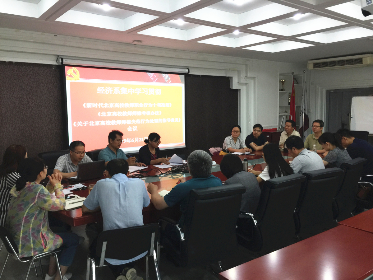 为深入贯彻习近平新时代中国特色社会主义思想和党的十九大精神,深入贯彻落实全国和北京市教育大会精神,6月21日上午,经济系全体教师在励学楼301会议室集中学习《新时代北京高校教师职业行为十项准则》、《北京高校教师师德考核办法》、《关于北京高校教师师德失范行为处理的指导意见》等三个文件。w66利来旗舰厅陶晓波副经理参加了本次会议。