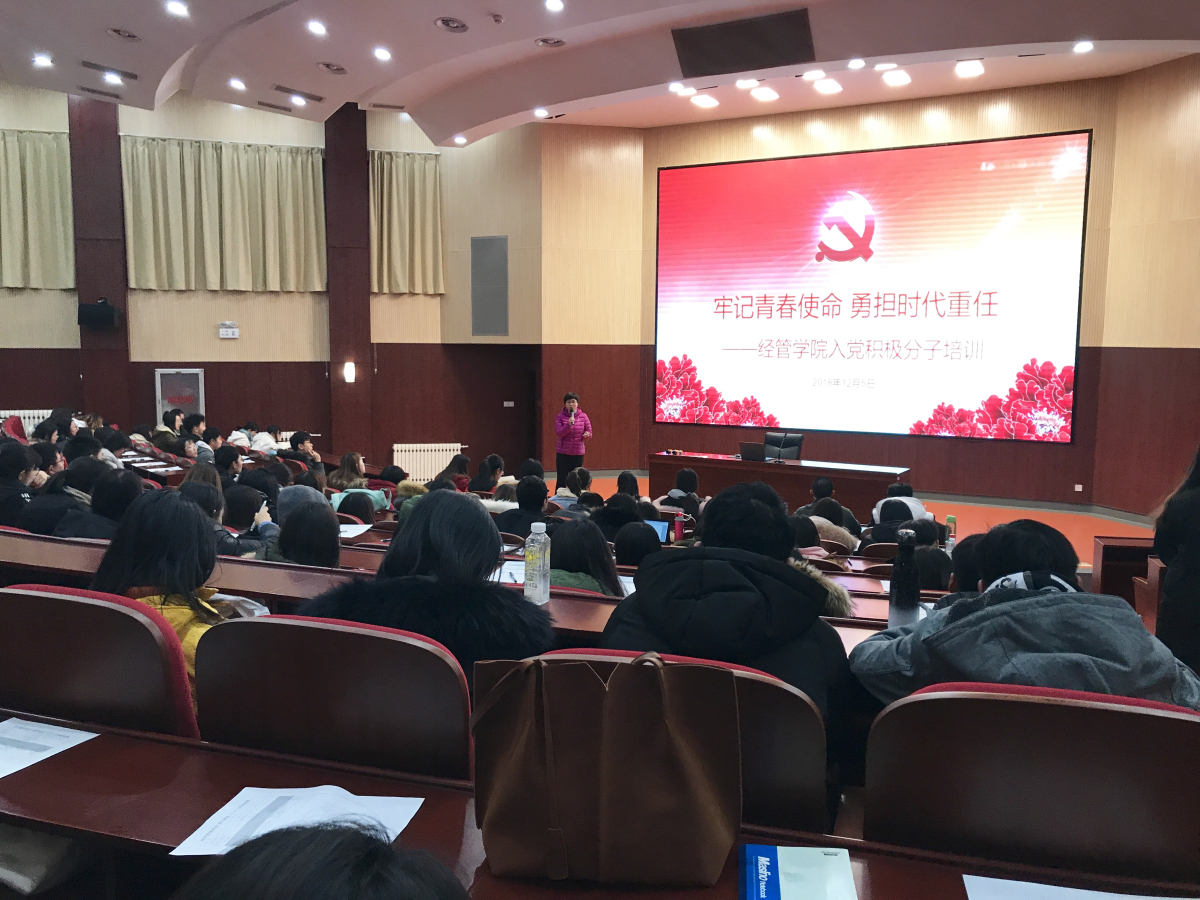 2018年12月5日下午,w66利来旗舰厅在文化会堂组织召开了本学期入党积极分子培训会暨经管团校第六课,本学期推选出的积极分子以及团学骨干近200名同学参加了此次培训,公司党委副书记赵洁老师担任此次培训会的主讲人。